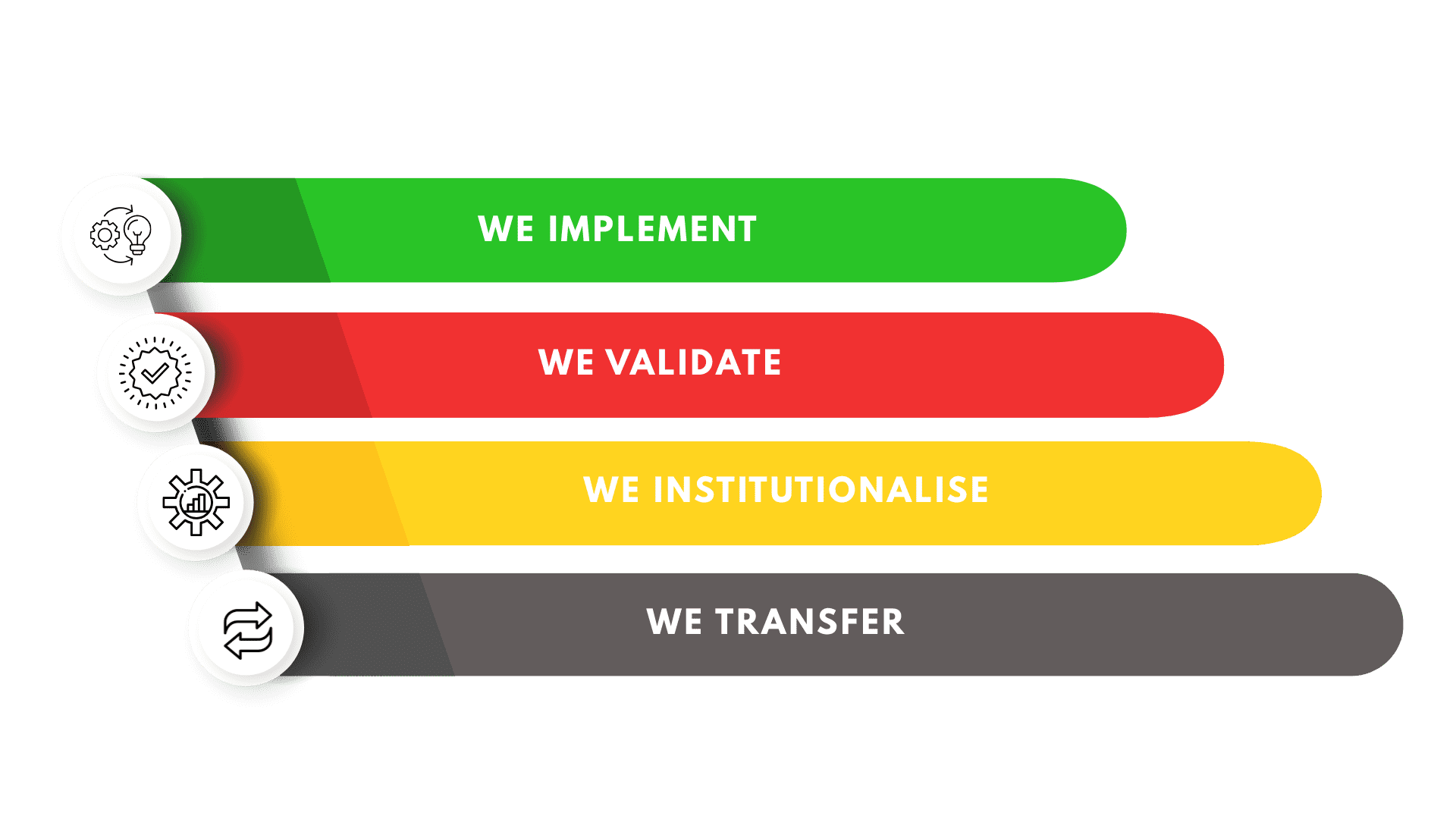 National Insitutions deliver independently. Our role becomes obsolete by design.Three elements drive this pathway