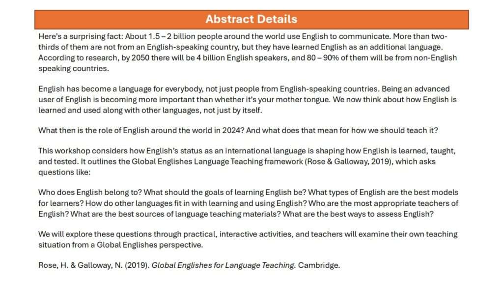 You are invited to our ONLINE WORKSHOP. The workshop will cover the topic “World Englishes and ELT Environments.” Please see the attached abstract for more information about what you can expect from this meeting.