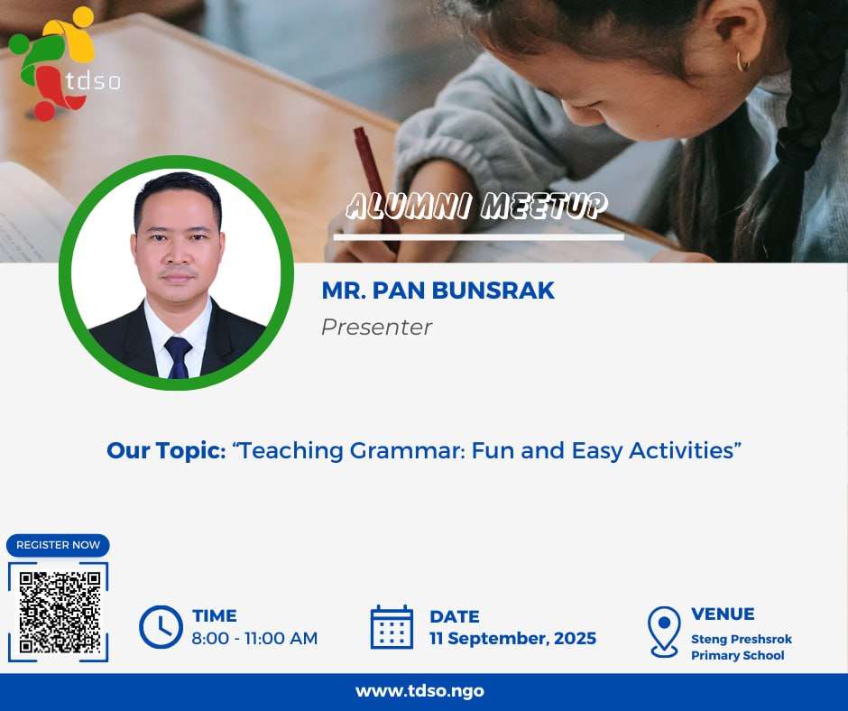 Join us for an inspiring workshop with Mr Pan Bunsrak, where you’ll discover innovative approaches to make grammar teaching engaging and effective for your students.  Date: Thursday, 11 September 2025 Time: 8:00 AM – 11:00 AM Location: Steng Preshrok Primary School  Workshop Objectives – By the end of the session, participants will be able to: Explore practical tips for designing