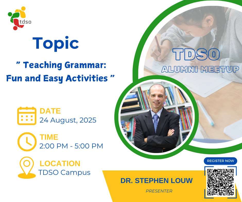 Topic: Teaching Grammar: Fun and Easy Activities Join us for a practical and interactive session with Dr. Stephen Louw, where you’ll explore engaging ways to make grammar lessons enjoyable and effective.  Date: Sunday, 24 August 2025 Time: 2:00 PM – 5:00 PM Location: TDSO Campus  Learning Outcomes: Teachers will be able to…- Use the inductive method to teach grammar- Apply context