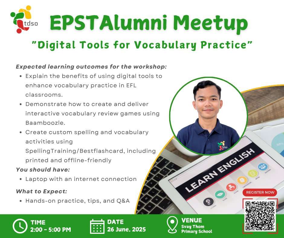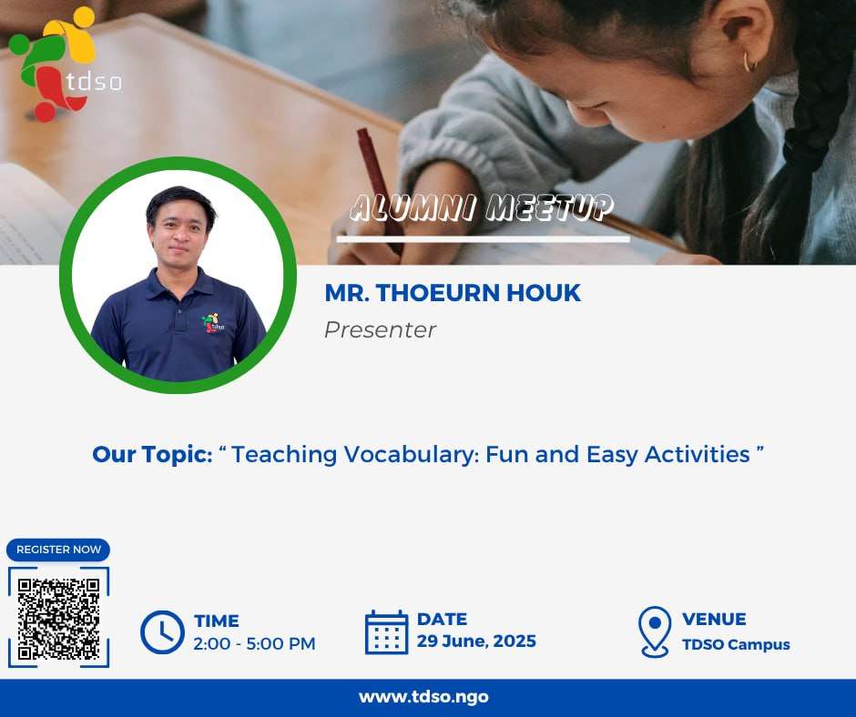 Join us for an engaging in-person session with Mr. Thoeurn Houk, where you’ll explore creative methods to teach vocabulary that are both effective and enjoyable for learners of all levels. Date: Sunday, 29 June 2025 Time: 2:00 PM – 5:00 PM Venue: TDSO Campus Learning Outcomes:- ​Acquiring effective techniques to elicit new words- Adopting authentic and engaging activities to adapt
