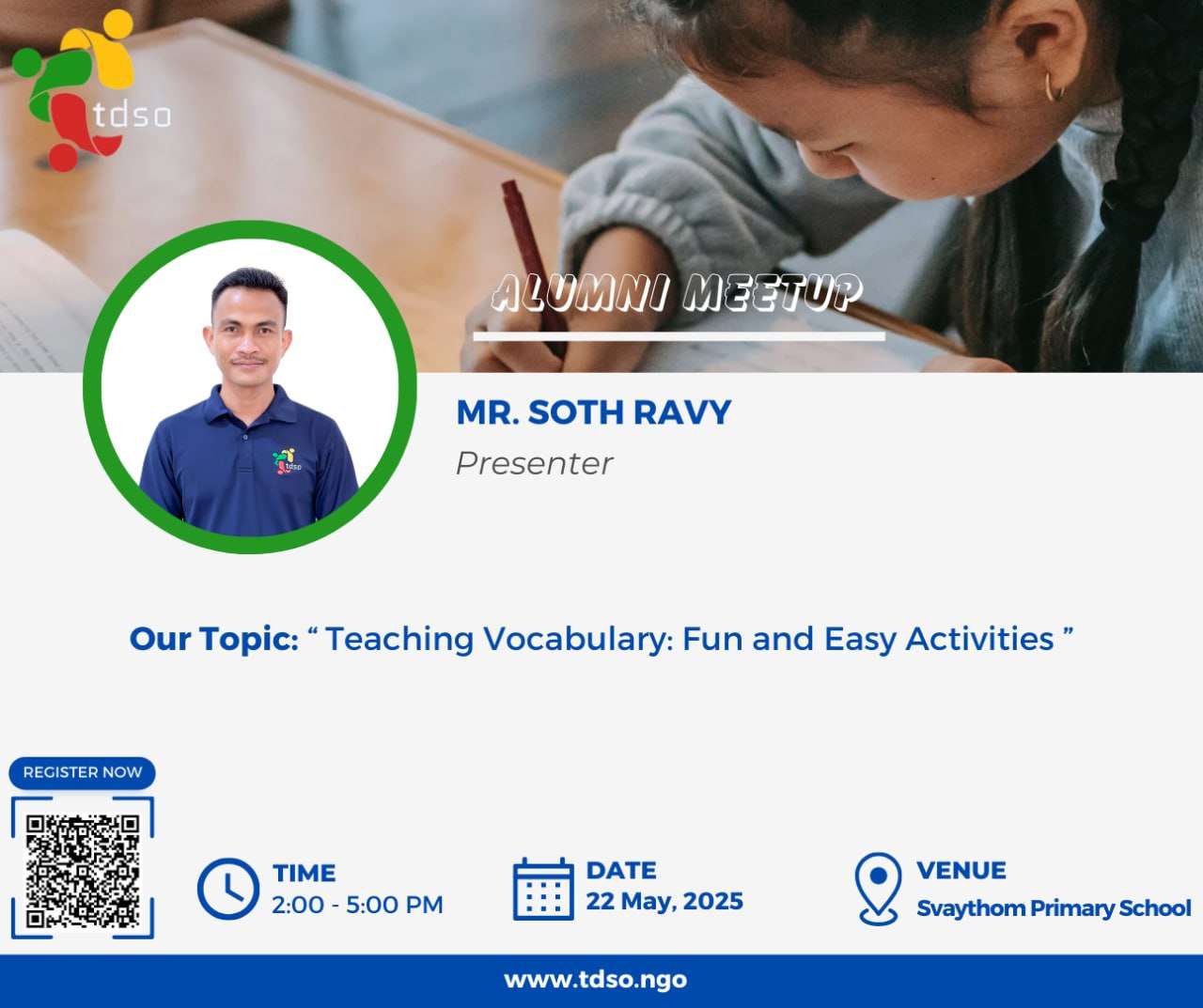 Don’t miss this practical session with Mr. Thoeurn Houk as we explore creative and effective ways to teach vocabulary in any classroom setting.  Date: Sunday, 18 May 2025 Time: 8:00 AM – 11:00 AM Venue: TDSO Campus  Learning Outcomes:- Acquiring effective techniques to elicit new words- Adopting authentic and engaging activities to adapt to various classrooms- Being introduced to a