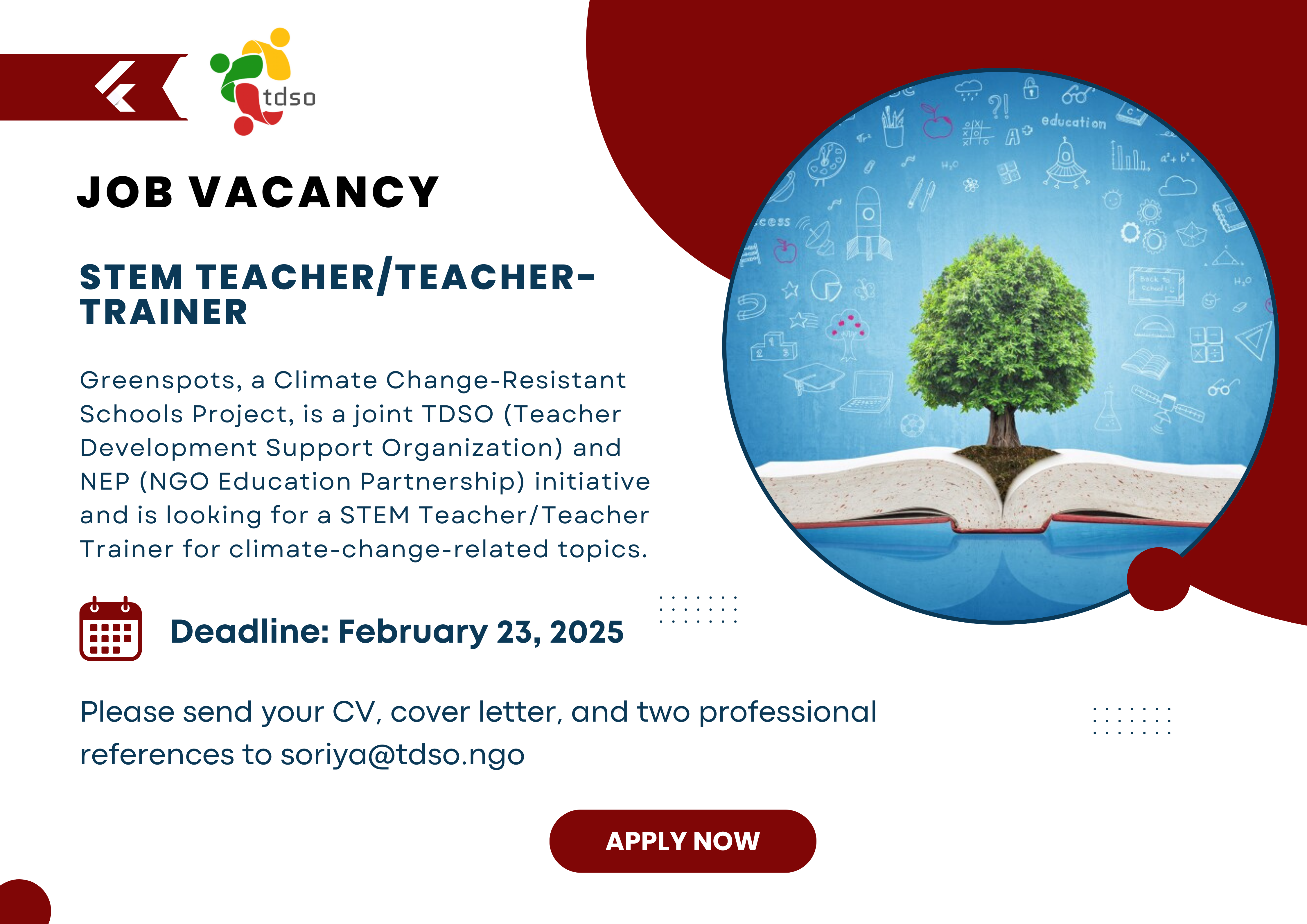 Job Title: STEM Teacher/Teacher-Trainer for climate-change-related topics Position Overview Cambodia is grappling with profound challenges as climate change increases temperatures, and unpredictable weather patterns profoundly affect daily life and the educational sector. Greenspots, a Climate Change-Resistant Schools Project, has been conceived as a proactive measure to create a sustainable and resilient educational environment to withstand these environmental adversities. This project