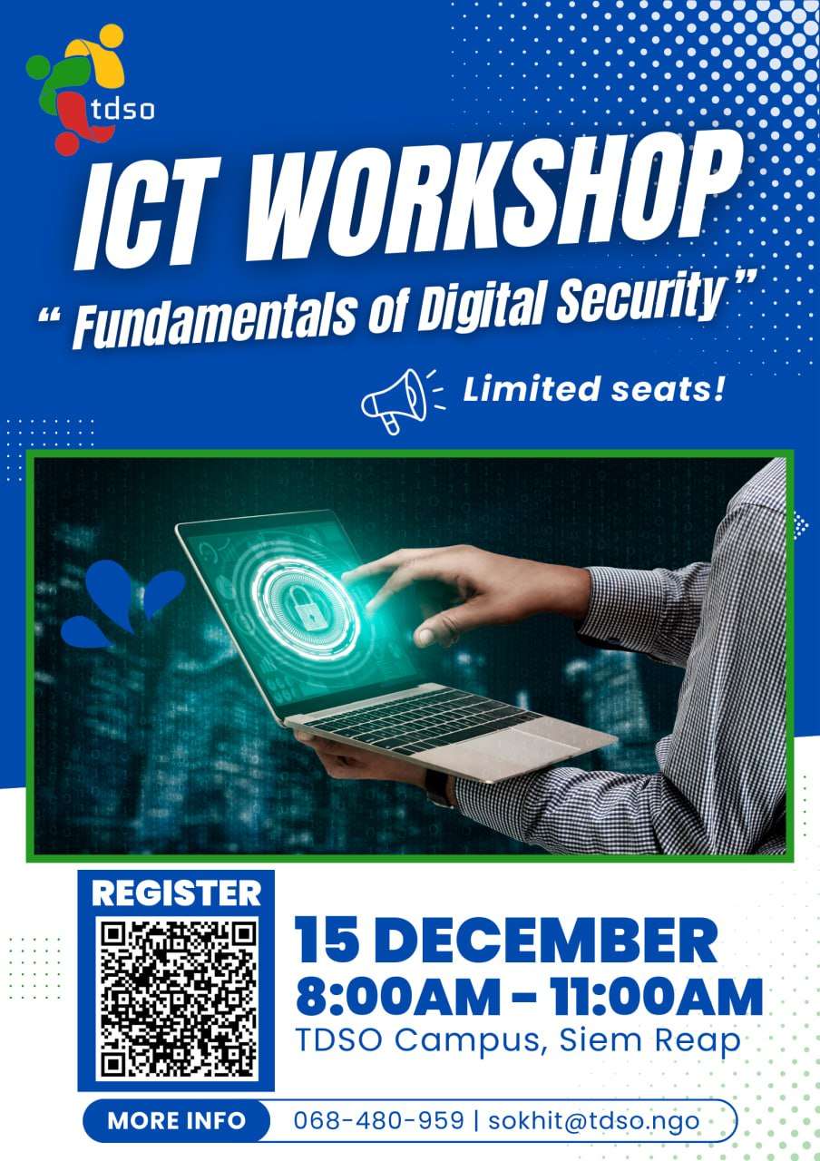 On Sunday, December 15, 2024 Topic: “Fundamentals of Digital Security” from 08:00 AM till 11:00 AM Don’t miss this chance to meet Mr. Kan Sokhit, TDSO’s IT Coordinator, and learn:  Internet risks and safety measures Key cybersecurity tips How to recognise phishing scams and types of hackers Tools for password management and security checks  Location: TDSO Campus in Siem Reap