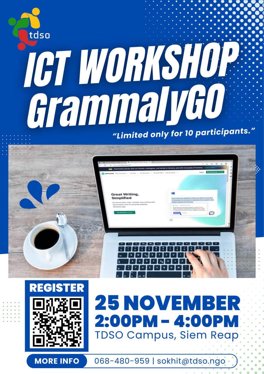 On Saturday, November 25 from 02:00 till 4:00 PM ICT workshop on GrammarlyGo Location: TDSO Campus in Siem Reap Limited seats GrammarlyGo is a powerful online tool that checks your text for grammar, spelling, and punctuation errors while offering suggestions for improvement. This workshop will guide you through the process of using GrammarlyGo to improve your writing, making it more